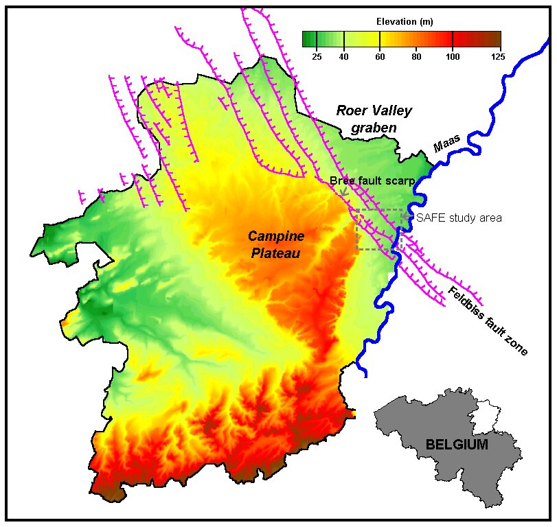 Fig. 3 – Elevation map of NE Belgium showing SW border faults of the Roer Valley graben, and location of the SAFE study area with respect to the Bree fault scarp.